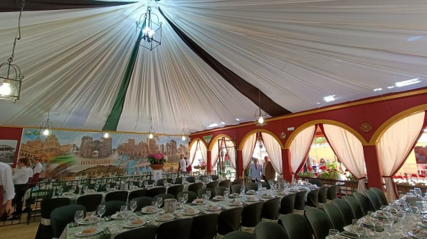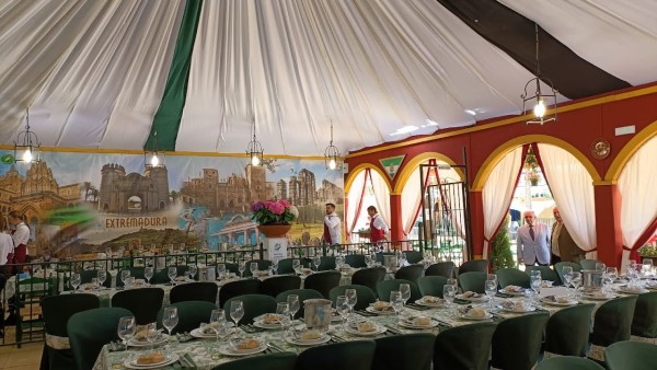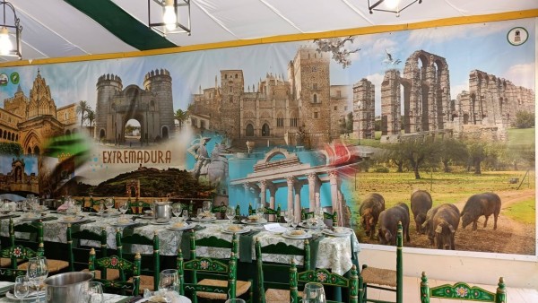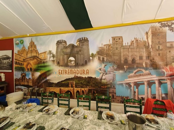 Tres zonas diferenciadas que han hecho peculiar a nuestra caseta: una la zona de socios, dedicada a Extremadura con un fantástico mural dedicado a la Comunidad; otra central con un ambiente abierto y acogedor en el que se podía observar como las banderas de Jerez y Extremadura se fusionaban en el vinilo que forraba la gran barra con determinados adornos extremeños y una tercera que dedicamos a Jerez en nuestra terraza lateral. Con ello hemos seguido fortaleciendo los lazos sociales, culturales y económicos con nuestra tierra de acogida.
