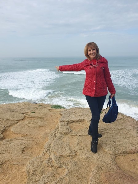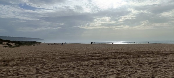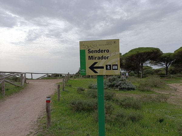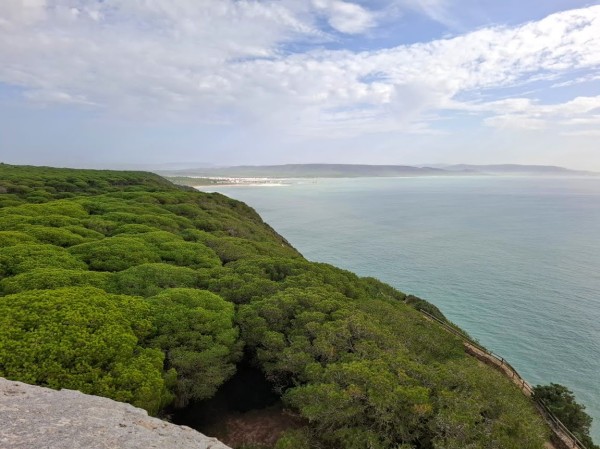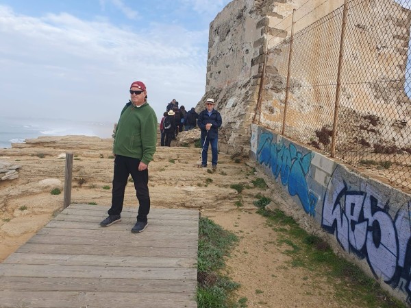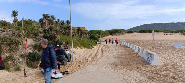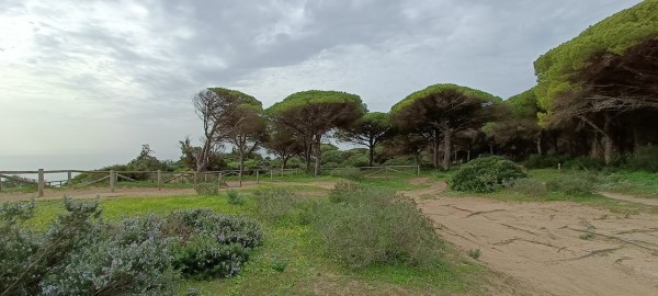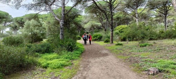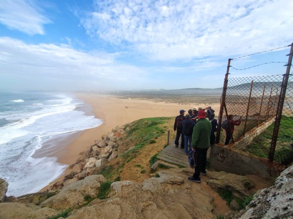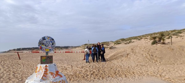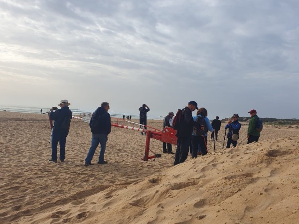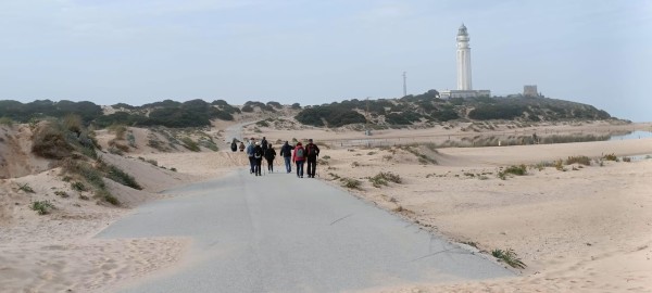 Continuamos hacia los Caños de Meca para comenzar el primero de los senderos programados. Las condiciones climatológicas excelentes, pues estaba algo nublado, con lo cual no teníamos mucho sol y había una luz preciosa. El entorno de Trafalgar estaba espectacular con las dunas, el bullicio de surfistas y un mar con un oleaje fuerte que después disfrutamos de cerca al llegar al promontorio donde está situado el faro. Allí nos recreamos un buen rato, disfrutando de las vistas del acantilado y de las playas del Palmar y Zahora. A la vuelta hacia el autobús observamos las maravillosas vistas de los Caños con el pinar de la Breña al fondo, que era nuestro siguiente sendero.