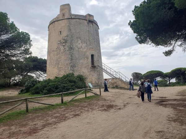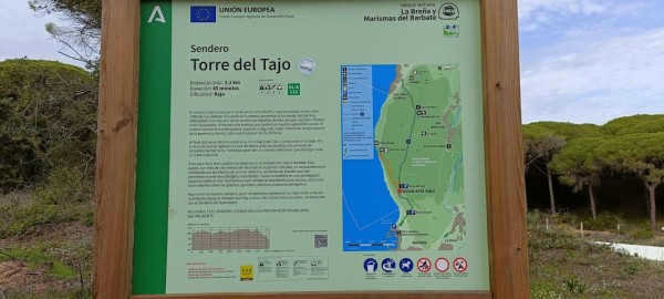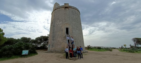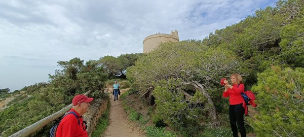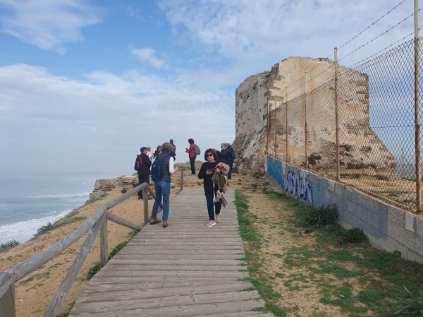 El autobús nos trasladó hasta el aparcamiento donde se inicia el sendero de la Torre del Tajo. Sendero muy cómodo y bien señalizado que atraviesa el pinar y que presenta una gran variedad de vegetación además de los pinos propiamente dichos. Culmina el sendero en la citada torre vigía, que fue construida en el s-XVI para defender la costa de los ataques de los corsarios que asomaban por la zona.