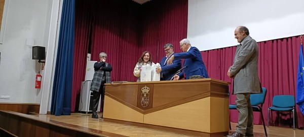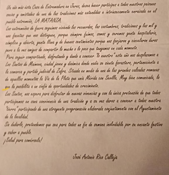 Por parte del Sr. Alcalde con sus palabras de bienvenida agradeció a toda la entrega por mantener y dar a conocer nuestras costumbres y elegir en ésta ocasión la localidad de Los Santos de Maimona para celebrar nuestra matanza didáctica. Acto seguido se procedió a la entrega de recuerdos por parte de la Casa de Extremadura, consistente en un precioso cuadro para el Excmo. Ayuntamiento, elaborado para la ocasión y otros obsequios para la primera autoridad local y Concejal colaboradora. También fue proyectado un documental sobre la localidad.