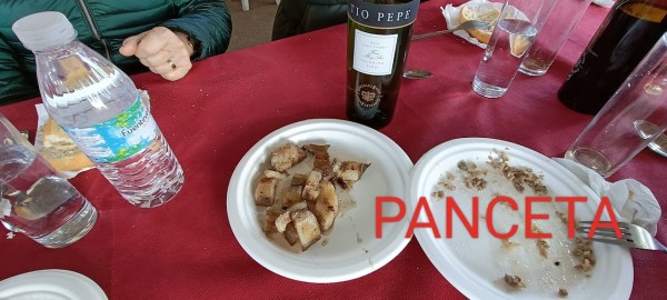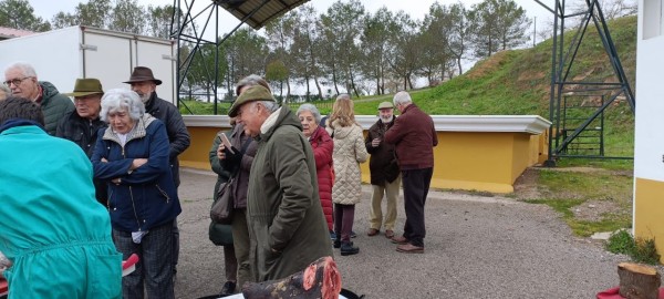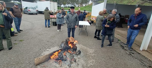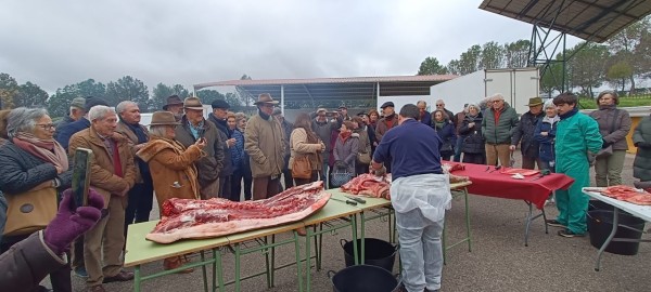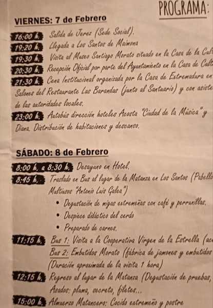 El sábado día 8, a partir de las 9,30 horas y después del oportuno desayuno en los hoteles respectivos, traslado al lugar previsto para la matanza en Sierra San Cristóbal, próximo a la ermita de San Isidro en Los Santos. Allí nos esperaba Segundo Muñoz encargado de servir el catering, venido desde Llerena junto a la persona encargada del despiece y encargarse de todo el servicio. Comenzándose con la degustación de unas migas extremeñas con café, anís, vino Solera de Jerez y dulces típicos. A continuación, el despiece didáctico del cerdo, que como cada año despierta un gran interés entre todos los asistentes.