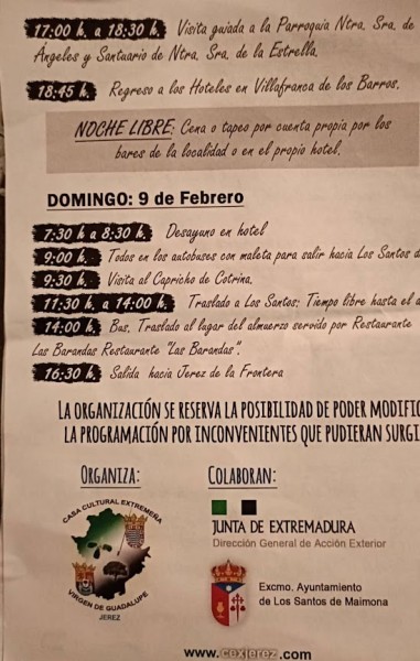 Emprendíamos el camino hacia Los santos de Maimona el viernes 7 de febrero sobre las 4 de la tarde partiendo desde la sede social en dos autobuses un total de 88 personas, con muchas ganas de pasarlo bien y disfrutar de los nuestro. Breve parada en Las Pajanosas para continuar nuestro viaje y llegada a Los Santos hacia las 20 horas donde éramos recibidos por una buena tromba de agua. Desde la parada de autobuses, nos dirigimos al Museo Santiago Morato, ubicado en la Casa de Cultura, lugar donde habría de celebrarse la recepción oficial por parte de las autoridades locales.