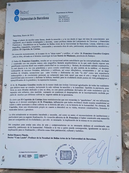 Se trata de una auténtica obra de arte, a pesar de no tener estudios, era capaz de construir lo que se proponía gracias a su increíble imaginación. Goza de muchos reconocimientos a nivel nacional e internacional, pero carece según se nos contó del apoyo de Entidades Oficiales extremeñas como la propia Junta de Extremadura o Diputación de Badajoz.