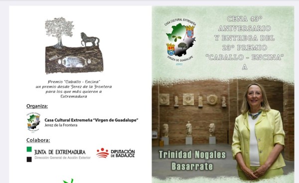 El pasado viernes 4 de abril, esta Casa Cultural Extremeña “Virgen de Guadalupe” ha entregado su XXIII Premio “Caballo-Encina” a la Directora del Museo Nacional de Arte Romano de Mérida y miembro de la Real Academia de la Artes y las Letras de Extremadura, Dª Trinidad nogales Basarrate por su impecable trayectoria como arqueóloga, su riguroso trabajo personal a nivel nacional e internacional, su esfuerzo, su labor docente y su extraordinaria contribución al campo de la arqueología de la Antigua Roma. Contribuyendo así a consolidar aún más la imagen de Extremadura.