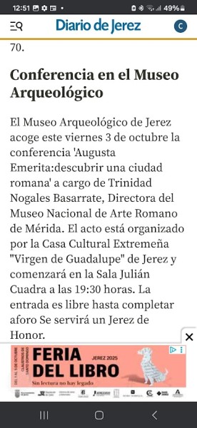 Magnifica la disertación ofrecida por Trinidad Nogales, Directora del Museo de Arte Romano de Mérida con motivo de su conferencia Augusta Emérita: Descubrir una ciudad romana en el Museo Arqueológico Municipal de Jerez el pasado día 3 de octubre a las 19,30 h.